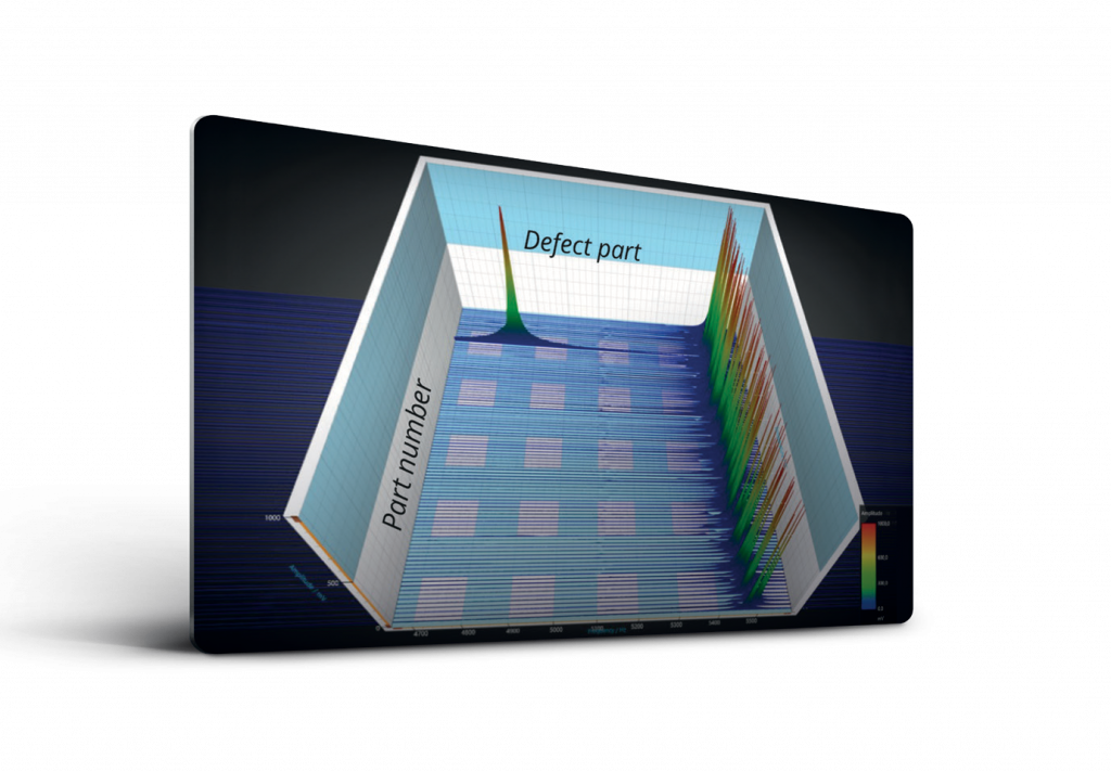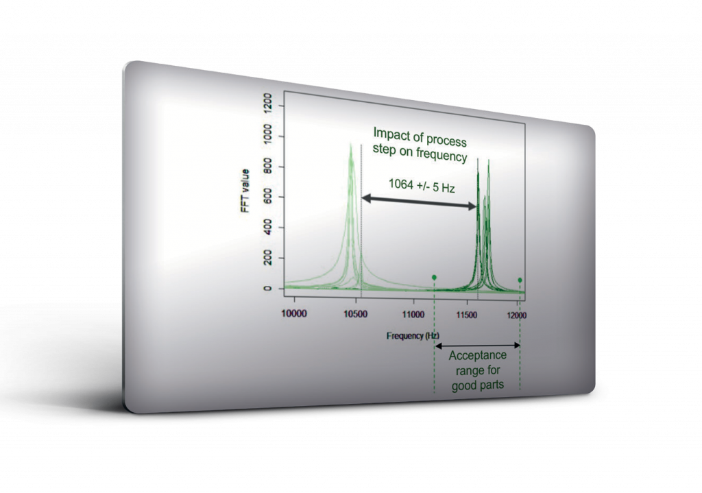 Identical parts show the same resonance vibration pattern. Deviations in frequency and/or damping reveal anomalies in the parts which are affecting the mechanical performance of the product. Setting boundary conditions for frequency and damping allows for 100% Quality Control.